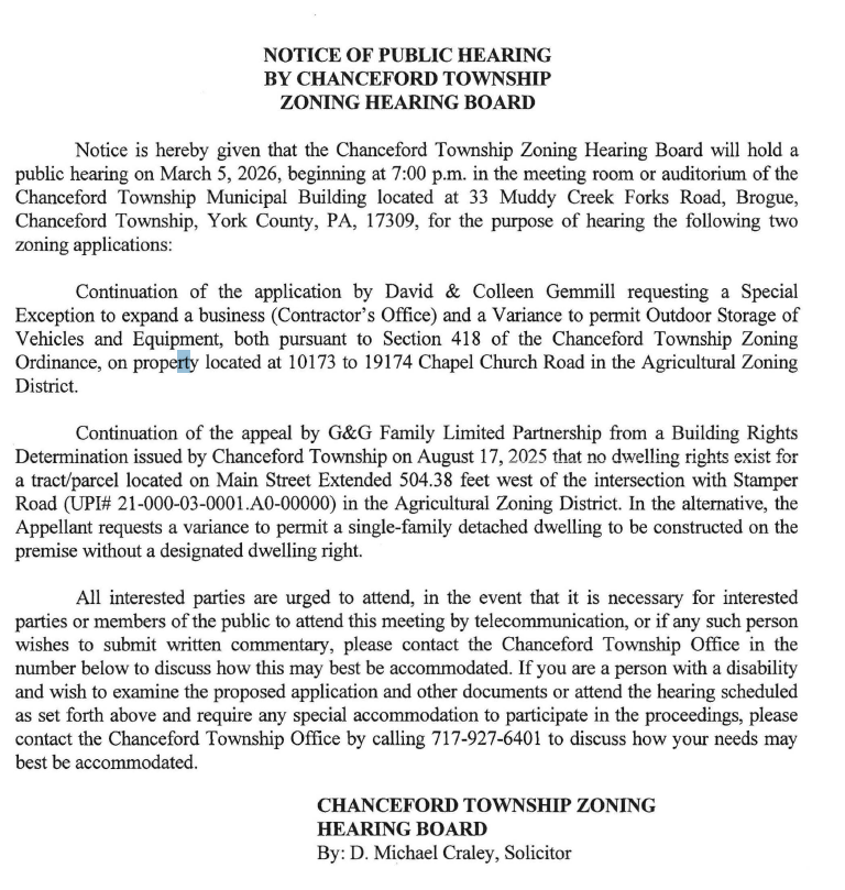 Notice is hereby given that the Chanceford Township Zoning Hearing Board will hold a